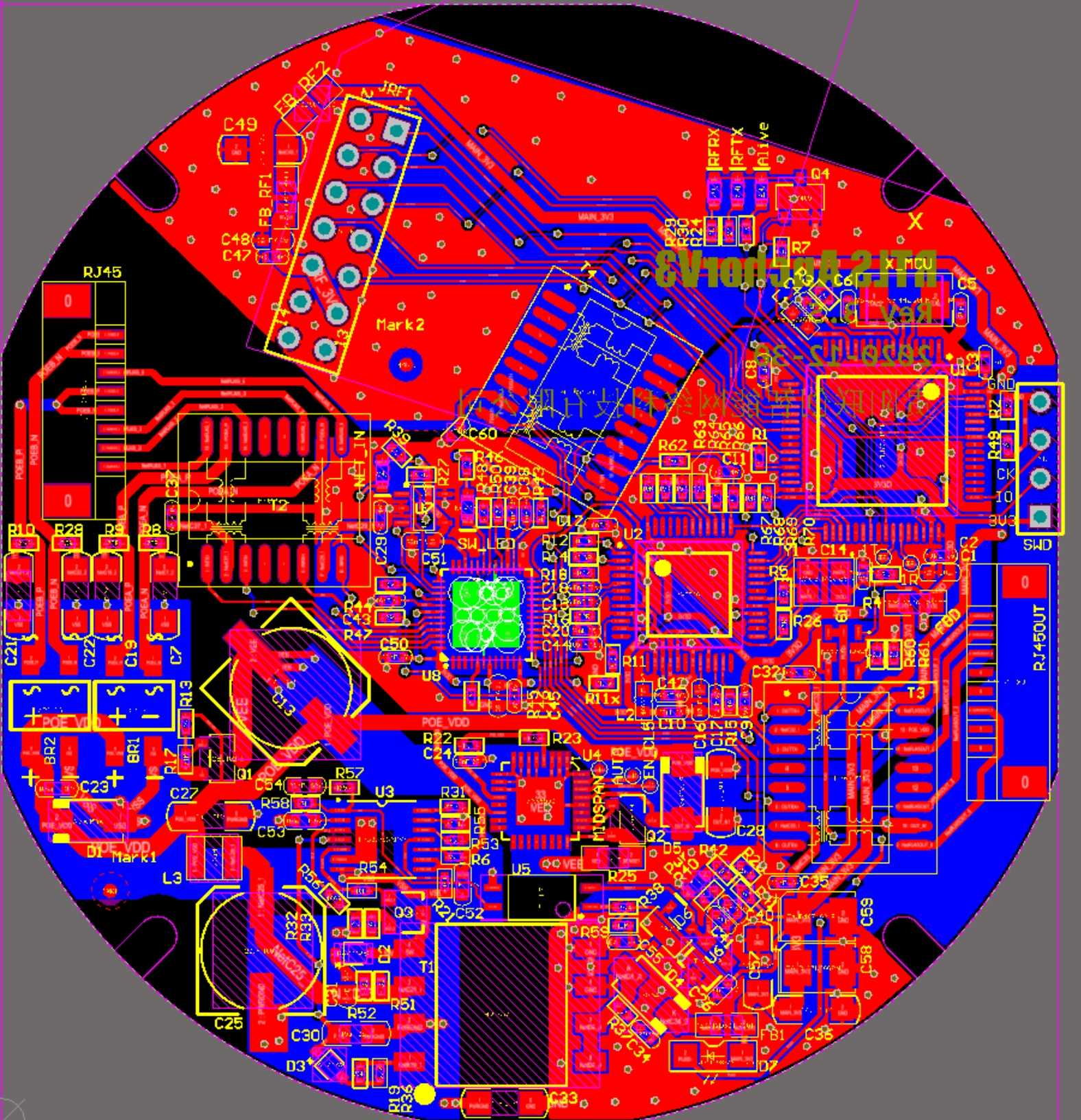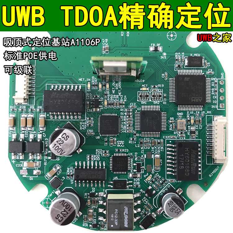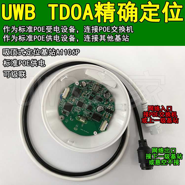 A1106P is a dual network port anchor with built-in network switch chip and POE power supply/power receiving chip. One network port is connected to the POE switch, and the other network port is connected to other lower-level anchors. Up to 6 anchors can be connected in series.