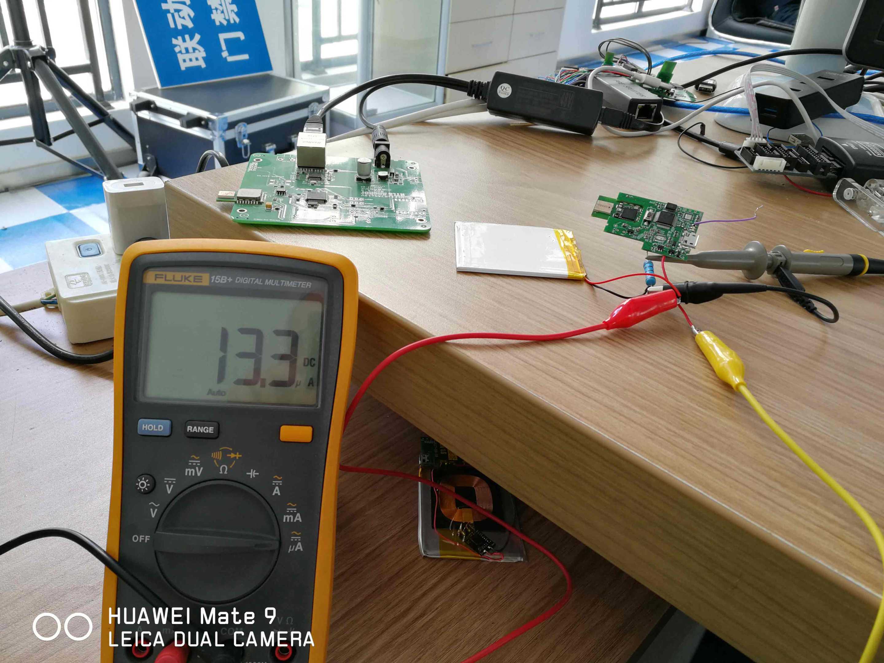 Through the oscilloscope, we can clearly see several working stages of the tag: it usually consumes almost no power when sleeping, starts to consume more power when awakened, further increases during the initialization phase, consumes the highest power when transmitting data packets, and then goes to sleep again.